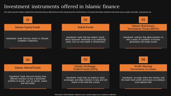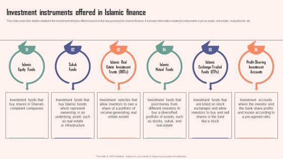 This slide covers the details related to the Investment vehicles offered based on the law governed for Islamic finance. It includes information related to instruments such as equity, real estate, mutual funds, etc. Here you can discover an assortment of the finest PowerPoint and Google Slides templates. With these templates, you can create presentations for a variety of purposes while simultaneously providing your audience with an eye-catching visual experience. Download Investment Instruments Offered In Islamic Comprehensive Guide Islamic Topics PDF to deliver an impeccable presentation. These templates will make your job of preparing presentations much quicker, yet still, maintain a high level of quality. Slidegeeks has experienced researchers who prepare these templates and write high-quality content for you. Later on, you can personalize the content by editing the Investment Instruments Offered In Islamic Comprehensive Guide Islamic Topics PDF. This slide covers the details related to the Investment vehicles offered based on the law governed for Islamic finance. It includes information related to instruments such as equity, real estate, mutual funds, etc.