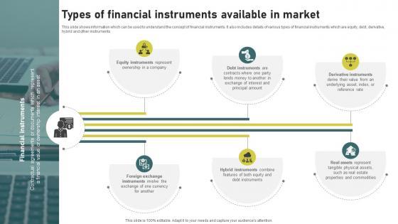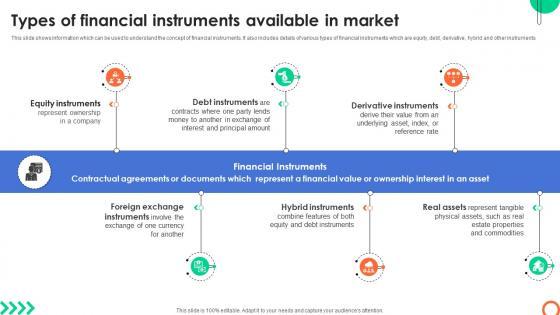 This slide shows information which can be used to understand the concept of financial instruments. It also includes details of various types of financial instruments which are equity, debt, derivative, hybrid and other instruments. Are you in need of a template that can accommodate all of your creative concepts This one is crafted professionally and can be altered to fit any style. Use it with Google Slides or PowerPoint. Include striking photographs, symbols, depictions, and other visuals. Fill, move around, or remove text boxes as desired. Test out color palettes and font mixtures. Edit and save your work, or work with colleagues. Download Types Of Financial Instruments Available In Market Mastering Investment Banking Fin SS V and observe how to make your presentation outstanding. Give an impeccable presentation to your group and make your presentation unforgettable. This slide shows information which can be used to understand the concept of financial instruments. It also includes details of various types of financial instruments which are equity, debt, derivative, hybrid and other instruments