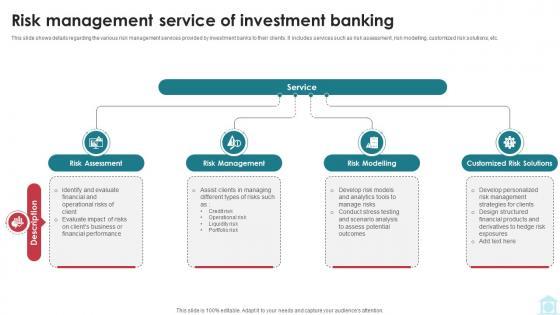 This slide shows details regarding the various risk management services provided by investment banks to their clients. It includes services such as risk assessment, risk modelling, customized risk solutions, etc. There are so many reasons you need a Risk Management Service Of Investment Banking Mastering Investment Banking Fin SS V The first reason is you can not spend time making everything from scratch, Thus, Slidegeeks has made presentation templates for you too. You can easily download these templates from our website easily. This slide shows details regarding the various risk management services provided by investment banks to their clients. It includes services such as risk assessment, risk modelling, customized risk solutions, etc.