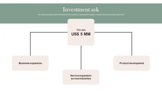 This slide represents amount of funding asked by operations management company. It includes reasons for funding requirement. Are you searching for a Investment Ask Mobile Solution Company Investor Fund Raising Pitch Deck Microsoft Pdf that is uncluttered, straightforward, and original Its easy to edit, and you can change the colors to suit your personal or business branding. For a presentation that expresses how much effort you have put in, this template is ideal With all of its features, including tables, diagrams, statistics, and lists, its perfect for a business plan presentation. Make your ideas more appealing with these professional slides. Download Investment Ask Mobile Solution Company Investor Fund Raising Pitch Deck Microsoft Pdf from Slidegeeks today. This slide represents amount of funding asked by operations management company. It includes reasons for funding requirement.