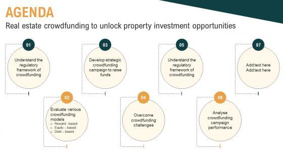 Find a pre-designed and impeccable Agenda Real Estate Crowdfunding To Unlock Property Investment Opportunities Fin SS V. The templates can ace your presentation without additional effort. You can download these easy-to-edit presentation templates to make your presentation stand out from others. So, what are you waiting for Download the template from Slidegeeks today and give a unique touch to your presentation. Our Agenda Real Estate Crowdfunding To Unlock Property Investment Opportunities Fin SS V are topically designed to provide an attractive backdrop to any subject. Use them to look like a presentation pro.