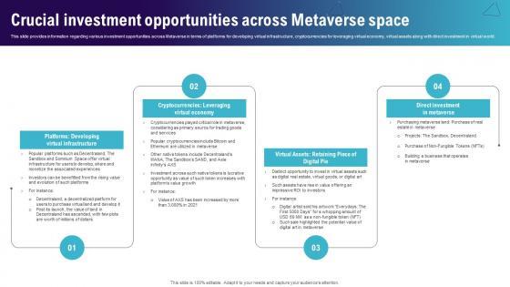 This slide provides information regarding various investment opportunities across Metaverse in terms of platforms for developing virtual infrastructure, cryptocurrencies for leveraging virtual economy, virtual assets along with direct investment in virtual world. Formulating a presentation can take up a lot of effort and time, so the content and message should always be the primary focus. The visuals of the PowerPoint can enhance the presenters message, so our Crucial Investment Opportunities Across Continuum Of Technology Revamping Business AI SS V was created to help save time. Instead of worrying about the design, the presenter can concentrate on the message while our designers work on creating the ideal templates for whatever situation is needed. Slidegeeks has experts for everything from amazing designs to valuable content, we have put everything into Crucial Investment Opportunities Across Continuum Of Technology Revamping Business AI SS V This slide provides information regarding various investment opportunities across Metaverse in terms of platforms for developing virtual infrastructure, cryptocurrencies for leveraging virtual economy, virtual assets along with direct investment in virtual world.
