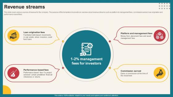 This slide covers various sources of revenue for the company. The purpose of this template is to provide an overview about revenue streams such as platform and management fees, commission earned, loan origination and performance based fees. Coming up with a presentation necessitates that the majority of the effort goes into the content and the message you intend to convey. The visuals of a PowerPoint presentation can only be effective if it supplements and supports the story that is being told. Keeping this in mind our experts created Revenue Streams Investment Opportunities Platform Funding Elevator Pitch Deck to reduce the time that goes into designing the presentation. This way, you can concentrate on the message while our designers take care of providing you with the right template for the situation. This slide covers various sources of revenue for the company. The purpose of this template is to provide an overview about revenue streams such as platform and management fees, commission earned, loan origination and performance based fees.