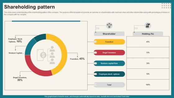 This slide covers understanding of the shareholding pattern of the company. The purpose of this template is to provide an overview on shareholders with maximum share and other stakeholders along with percentages of shares in the company with key insights. This modern and well-arranged Shareholding Pattern Investment Opportunities Platform Funding Elevator Pitch Deck provides lots of creative possibilities. It is very simple to customize and edit with the Powerpoint Software. Just drag and drop your pictures into the shapes. All facets of this template can be edited with Powerpoint, no extra software is necessary. Add your own material, put your images in the places assigned for them, adjust the colors, and then you can show your slides to the world, with an animated slide included. This slide covers understanding of the shareholding pattern of the company. The purpose of this template is to provide an overview on shareholders with maximum share and other stakeholders along with percentages of shares in the company with key insights.