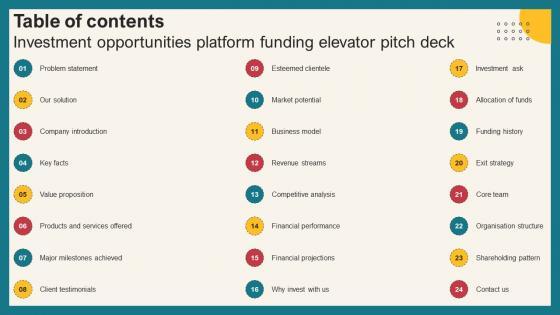 This Table Of Contents Investment Opportunities Platform Funding Elevator Pitch Deck is perfect for any presentation, be it in front of clients or colleagues. It is a versatile and stylish solution for organizing your meetings. The Table Of Contents Investment Opportunities Platform Funding Elevator Pitch Deck features a modern design for your presentation meetings. The adjustable and customizable slides provide unlimited possibilities for acing up your presentation. Slidegeeks has done all the homework before launching the product for you. So, do not wait, grab the presentation templates today Our Table Of Contents Investment Opportunities Platform Funding Elevator Pitch Deck are topically designed to provide an attractive backdrop to any subject. Use them to look like a presentation pro.