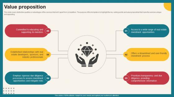 This slide covers distinctive qualities or advantages of the services that set it apart from competitors. The purpose of this template is to highlight the key selling points and value proposition that make the services unique and appealing. Welcome to our selection of the Value Proposition Investment Opportunities Platform Funding Elevator Pitch Deck. These are designed to help you showcase your creativity and bring your sphere to life. Planning and Innovation are essential for any business that is just starting out. This collection contains the designs that you need for your everyday presentations. All of our PowerPoints are 100Percent editable, so you can customize them to suit your needs. This multi-purpose template can be used in various situations. Grab these presentation templates today. This slide covers distinctive qualities or advantages of the services that set it apart from competitors. The purpose of this template is to highlight the key selling points and value proposition that make the services unique and appealing.