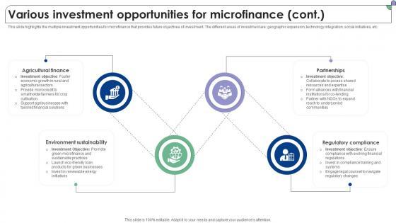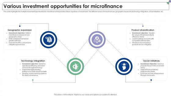 This slide highlights the multiple investment opportunities for microfinance that provides future objectives of investment. The different areas of investment are geographic expansion, technology integration, social initiatives, etc. Formulating a presentation can take up a lot of effort and time, so the content and message should always be the primary focus. The visuals of the PowerPoint can enhance the presenters message, so our Various Investment Opportunities For Microfinance Complete Guide To Microfinance Fin SS V was created to help save time. Instead of worrying about the design, the presenter can concentrate on the message while our designers work on creating the ideal templates for whatever situation is needed. Slidegeeks has experts for everything from amazing designs to valuable content, we have put everything into Various Investment Opportunities For Microfinance Complete Guide To Microfinance Fin SS V. This slide highlights the multiple investment opportunities for microfinance that provides future objectives of investment. The different areas of investment are geographic expansion, technology integration, social initiatives, etc.