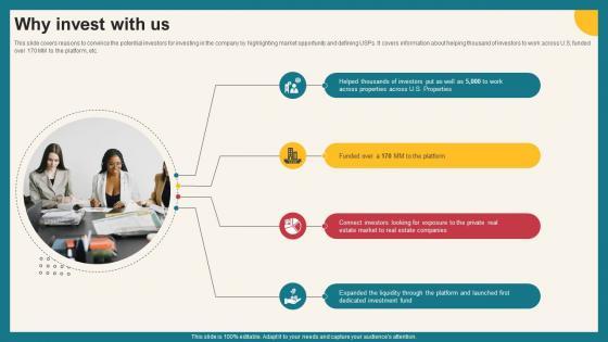 This slide covers reasons to convince the potential investors for investing in the company by highlighting market opportunity and defining USPs. It covers information about helping thousand of investors to work across U.S, funded over 170 MM to the platform, etc. Explore a selection of the finest Why Invest With Us Investment Opportunities Platform Funding Elevator Pitch Deck here. With a plethora of professionally designed and pre-made slide templates, you can quickly and easily find the right one for your upcoming presentation. You can use our Why Invest With Us Investment Opportunities Platform Funding Elevator Pitch Deck to effectively convey your message to a wider audience. Slidegeeks has done a lot of research before preparing these presentation templates. The content can be personalized and the slides are highly editable. Grab templates today from Slidegeeks. This slide covers reasons to convince the potential investors for investing in the company by highlighting market opportunity and defining USPs. It covers information about helping thousand of investors to work across U.S, funded over 170 MM to the platform, etc.