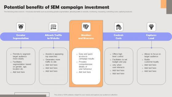 The following slide covers to It includes elements such as providing greater segmentation, attracting traffic to website, monitoring, measuring, controlling costs, capturing leads etc. Presenting this PowerPoint presentation, titled Improving PPC Campaign Results Potential Benefits Of Sem Campaign Investment Pictures Pdf, with topics curated by our researchers after extensive research. This editable presentation is available for immediate download and provides attractive features when used. Download now and captivate your audience. Presenting this Improving PPC Campaign Results Potential Benefits Of Sem Campaign Investment Pictures Pdf. Our researchers have carefully researched and created these slides with all aspects taken into consideration. This is a completely customizable Improving PPC Campaign Results Potential Benefits Of Sem Campaign Investment Pictures Pdf that is available for immediate downloading. Download now and make an impact on your audience. Highlight the attractive features available with our PPTs. The following slide covers to It includes elements such as providing greater segmentation, attracting traffic to website, monitoring, measuring, controlling costs, capturing leads etc.