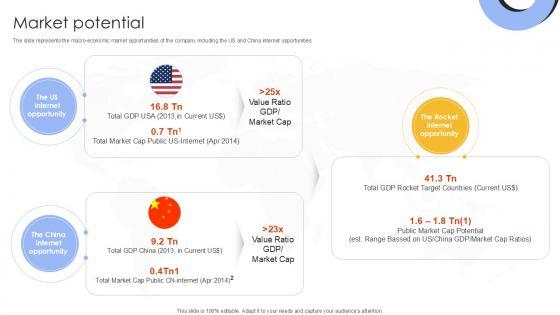 The slide represents the macro-economic market opportunities of the company including the US and China internet opportunities. Get a simple yet stunning designed Market Potential Investment Company Investor Funding Elevator Ppt Example. It is the best one to establish the tone in your meetings. It is an excellent way to make your presentations highly effective. So, download this PPT today from Slidegeeks and see the positive impacts. Our easy-to-edit Market Potential Investment Company Investor Funding Elevator Ppt Example can be your go-to option for all upcoming conferences and meetings. So, what are you waiting for Grab this template today. The slide represents the macro-economic market opportunities of the company including the US and China internet opportunities