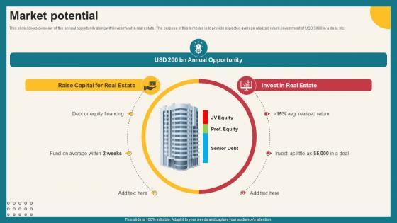 This slide covers overview of the annual opportunity along with investment in real estate. The purpose of this template is to provide expected average realized return, investment of USD 5000 in a deal, etc. Are you in need of a template that can accommodate all of your creative concepts This one is crafted professionally and can be altered to fit any style. Use it with Google Slides or PowerPoint. Include striking photographs, symbols, depictions, and other visuals. Fill, move around, or remove text boxes as desired. Test out color palettes and font mixtures. Edit and save your work, or work with colleagues. Download Market Potential Investment Opportunities Platform Funding Elevator Pitch Deck and observe how to make your presentation outstanding. Give an impeccable presentation to your group and make your presentation unforgettable. This slide covers overview of the annual opportunity along with investment in real estate. The purpose of this template is to provide expected average realized return, investment of USD 5000 in a deal, etc.