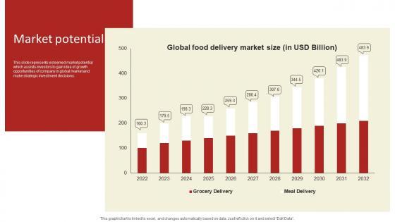 This slide represents esteemed market potential which assists investors to gain idea of growth opportunities of company in global market and make strategic investment decisions. Coming up with a presentation necessitates that the majority of the effort goes into the content and the message you intend to convey. The visuals of a PowerPoint presentation can only be effective if it supplements and supports the story that is being told. Keeping this in mind our experts created Market Potential Online Delivery Investment Funding Elevator Pitch Deck Summary Pdf to reduce the time that goes into designing the presentation. This way, you can concentrate on the message while our designers take care of providing you with the right template for the situation. This slide represents esteemed market potential which assists investors to gain idea of growth opportunities of company in global market and make strategic investment decisions.