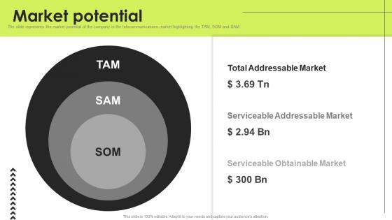 Are you in need of a template that can accommodate all of your creative concepts This one is crafted professionally and can be altered to fit any style. Use it with Google Slides or PowerPoint. Include striking photographs, symbols, depictions, and other visuals. Fill, move around, or remove text boxes as desired. Test out color palettes and font mixtures. Edit and save your work, or work with colleagues. Download Market Potential Real Estate Investment Funding Elevator Template PDF and observe how to make your presentation outstanding. Give an impeccable presentation to your group and make your presentation unforgettable. The slide represents the market potential of the company in the telecommunications market highlighting the TAM, SOM and SAM.