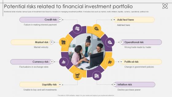 Mentioned slide includes various types of investment risks faced by investors in managing investment portfolio.It includes risks such as market, credit, inflation, liquidity, currency, operational, political risk. Do you know about Slidesgeeks Potential Risks Related To Financial Investment Portfolio Investment Fund PPT Sample These are perfect for delivering any kind od presentation. Using it, create PowerPoint presentations that communicate your ideas and engage audiences. Save time and effort by using our pre designed presentation templates that are perfect for a wide range of topic. Our vast selection of designs covers a range of styles, from creative to business, and are all highly customizable and easy to edit. Download as a PowerPoint template or use them as Google Slides themes. Mentioned slide includes various types of investment risks faced by investors in managing investment portfolio.It includes risks such as market, credit, inflation, liquidity, currency, operational, political risk.