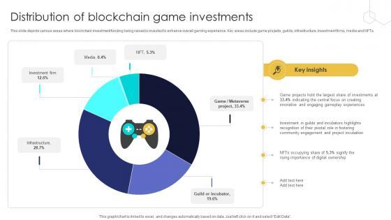 This slide depicts various areas where blockchain investment funding being raised is invested to enhance overall gaming experience. Key areas include game projects, guilds, infrastructure, investment firms, media and NFTs. Welcome to our selection of the Unlocking The Potential Of Distribution Of Blockchain Game Investments BCT SS V. These are designed to help you showcase your creativity and bring your sphere to life. Planning and Innovation are essential for any business that is just starting out. This collection contains the designs that you need for your everyday presentations. All of our PowerPoints are 100Percent editable, so you can customize them to suit your needs. This multi-purpose template can be used in various situations. Grab these presentation templates today. This slide depicts various areas where blockchain investment funding being raised is invested to enhance overall gaming experience. Key areas include game projects, guilds, infrastructure, investment firms, media and NFTs.