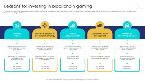 This slide mentions various reasons individuals or corporates can consider for investing in blockchain based gaming. It includes growing market, increased adoption of technology, unique value proposition. Community driven development and high potential. Formulating a presentation can take up a lot of effort and time, so the content and message should always be the primary focus. The visuals of the PowerPoint can enhance the presenters message, so our Unlocking The Potential Of Reasons For Investing In Blockchain Gaming BCT SS V was created to help save time. Instead of worrying about the design, the presenter can concentrate on the message while our designers work on creating the ideal templates for whatever situation is needed. Slidegeeks has experts for everything from amazing designs to valuable content, we have put everything into Unlocking The Potential Of Reasons For Investing In Blockchain Gaming BCT SS V. This slide mentions various reasons individuals or corporates can consider for investing in blockchain based gaming. It includes growing market, increased adoption of technology, unique value proposition. Community driven development and high potential.