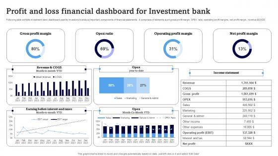 Following slide exhibits investment bank dashboard used by investors to analyze important components of financial statements . it comprises of elements such gross profit margin, OPEX ratio, operating profit margins, net profit margin, revenue andCOGS Pitch your topic with ease and precision using this Profit And Loss Financial Dashboard For Investment Bank Download Pdf. This layout presents information on Gross Profit Margin, Opex Ratio, Operating Profit Margin. It is also available for immediate download and adjustment. So, changes can be made in the color, design, graphics or any other component to create a unique layout. Following slide exhibits investment bank dashboard used by investors to analyze important components of financial statements . it comprises of elements such gross profit margin, OPEX ratio, operating profit margins, net profit margin, revenue andCOGS