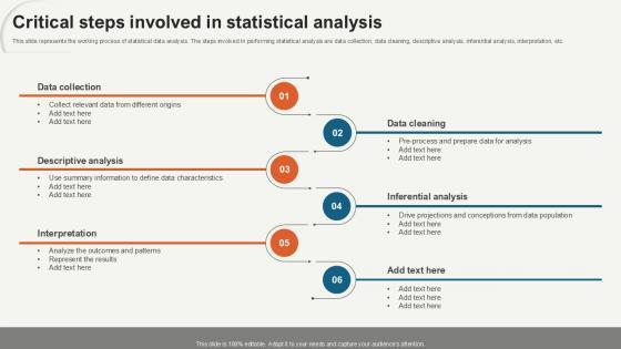 This slide represents the working process of statistical data analysis. The steps involved in performing statistical analysis are data collection, data cleaning, descriptive analysis, inferential analysis, interpretation, etc. Slidegeeks is here to make your presentations a breeze with Critical Steps Involved In Statistical Data Analytics For Informed Decision Ppt Presentation With our easy-to-use and customizable templates, you can focus on delivering your ideas rather than worrying about formatting. With a variety of designs to choose from, you are sure to find one that suits your needs. And with animations and unique photos, illustrations, and fonts, you can make your presentation pop. So whether you are giving a sales pitch or presenting to the board, make sure to check out Slidegeeks first This slide represents the working process of statistical data analysis. The steps involved in performing statistical analysis are data collection, data cleaning, descriptive analysis, inferential analysis, interpretation, etc.