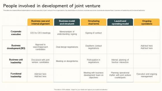 This slide showcases different stakeholders involved in execution of joint venture of two organizations. Key stakeholders involved are corporate executives, business development team, business unit leadership and functional leadership. This modern and well-arranged People Involved In Development Of Joint Venture Market Expansion Through Structure Pdf provides lots of creative possibilities. It is very simple to customize and edit with the Powerpoint Software. Just drag and drop your pictures into the shapes. All facets of this template can be edited with Powerpoint no extra software is necessary. Add your own material, put your images in the places assigned for them, adjust the colors, and then you can show your slides to the world, with an animated slide included. This slide showcases different stakeholders involved in execution of joint venture of two organizations. Key stakeholders involved are corporate executives, business development team, business unit leadership and functional leadership.