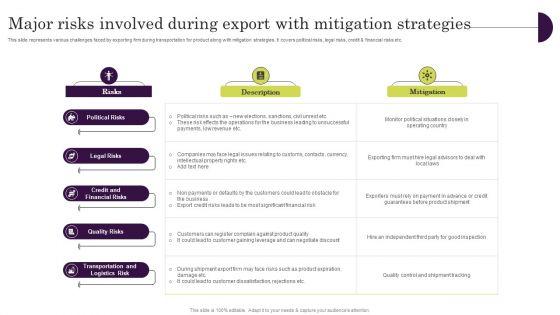 This slide represents various challenges faced by exporting firm during transportation for product along with mitigation strategies. It covers political risks, legal risks, credit and financial risks etc. Do you know about Slidesgeeks Major Risks Involved During Export With Mitigation Strategies Ppt Summary Files PDF These are perfect for delivering any kind od presentation. Using it, create PowerPoint presentations that communicate your ideas and engage audiences. Save time and effort by using our pre designed presentation templates that are perfect for a wide range of topic. Our vast selection of designs covers a range of styles, from creative to business, and are all highly customizable and easy to edit. Download as a PowerPoint template or use them as Google Slides themes.