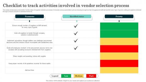 This slides showcases a checklist to monitor steps of supplier selection procedure. It includes various parameter such as ensuring enough number of suppliers to fulfil demand for every type of goods, inviting all suppliers to tender through company website or advertisements etc. Showcasing this set of slides titled Checklist To Track Activities Involved In Vendor Selection Process Graphics Pdf. The topics addressed in these templates are Parameter, Qualified status, Priority. All the content presented in this PPT design is completely editable. Download it and make adjustments in color, background, font etc. as per your unique business setting. This slides showcases a checklist to monitor steps of supplier selection procedure. It includes various parameter such as ensuring enough number of suppliers to fulfil demand for every type of goods, inviting all suppliers to tender through company website or advertisements etc.