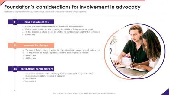This template covers initial considerations, avenues for change, and institutional considerations while making strategic adjustments. Slidegeeks is here to make your presentations a breeze with Foundations Considerations Involvement Not For Profit Venture Playbook Graphics Pdf With our easy to use and customizable templates, you can focus on delivering your ideas rather than worrying about formatting. With a variety of designs to choose from, you are sure to find one that suits your needs. And with animations and unique photos, illustrations, and fonts, you can make your presentation pop. So whether you are giving a sales pitch or presenting to the board, make sure to check out Slidegeeks first This template covers initial considerations, avenues for change, and institutional considerations while making strategic adjustments.