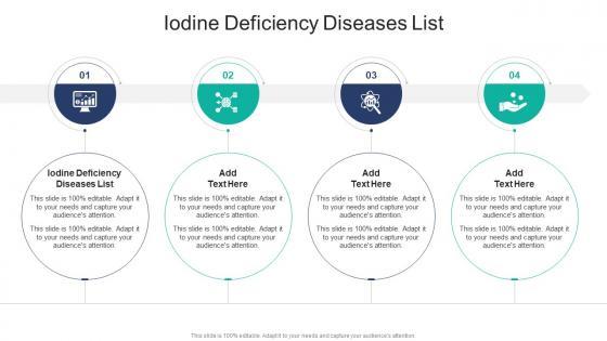 Presenting our innovatively designed set of slides titled Iodine Deficiency Diseases List In Powerpoint And Google Slides Cpb. This completely editable PowerPoint graphic exhibits Iodine Deficiency Diseases List that will help you convey the message impactfully. It can be accessed with Google Slides and is available in both standard screen and widescreen aspect ratios. Apart from this, you can download this well structured PowerPoint template design in different formats like PDF, JPG, and PNG. So, click the download button now to gain full access to this PPT design. Our Iodine Deficiency Diseases List In Powerpoint And Google Slides Cpb are topically designed to provide an attractive backdrop to any subject. Use them to look like a presentation pro.