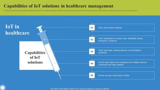 Following slide exhibits capabilities of internet of things IoT solutions that help in effective hospital management. It includes elements such as track patients, employees, high value medical devices etc. This Capabilities Of IoT Solutions Healthcare Deploying IoT Solutions For Enhanced Healthcare Guidelines Pdf is perfect for any presentation, be it in front of clients or colleagues. It is a versatile and stylish solution for organizing your meetings. The Capabilities Of IoT Solutions Healthcare Deploying IoT Solutions For Enhanced Healthcare Guidelines Pdf features a modern design for your presentation meetings. The adjustable and customizable slides provide unlimited possibilities for acing up your presentation. Slidegeeks has done all the homework before launching the product for you. So, do not wait, grab the presentation templates today Following slide exhibits capabilities of internet of things IoT solutions that help in effective hospital management. It includes elements such as track patients, employees, high value medical devices etc.