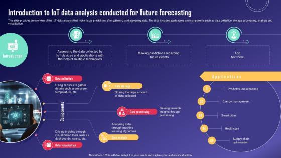 This slide provides an overview of the IoT data analysis that make future predictions after gathering and assessing data. The slide includes applications and components such as data collection, storage, processing, analysis and visualization. Are you in need of a template that can accommodate all of your creative concepts This one is crafted professionally and can be altered to fit any style. Use it with Google Slides or PowerPoint. Include striking photographs, symbols, depictions, and other visuals. Fill, move around, or remove text boxes as desired. Test out color palettes and font mixtures. Edit and save your work, or work with colleagues. Download Introduction To IoT Data Analysis IoT Fleet Monitoring Ppt PowerPoint IoT SS V and observe how to make your presentation outstanding. Give an impeccable presentation to your group and make your presentation unforgettable. This slide provides an overview of the IoT data analysis that make future predictions after gathering and assessing data. The slide includes applications and components such as data collection, storage, processing, analysis and visualization.