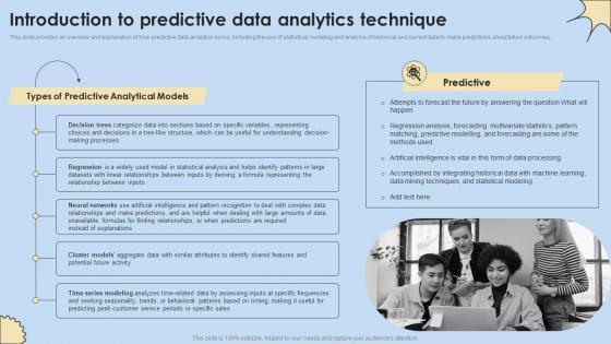 This slide provides an overview and explanation of how predictive data analytics works, including the use of statistical modeling and analysis of historical and current data to make predictions about future outcomes. This Introduction To Predictive Data Analytics Technique Internet Of Things Analysis Download Pdf is perfect for any presentation, be it in front of clients or colleagues. It is a versatile and stylish solution for organizing your meetings. The Introduction To Predictive Data Analytics Technique Internet Of Things Analysis Download Pdf features a modern design for your presentation meetings. The adjustable and customizable slides provide unlimited possibilities for acing up your presentation. Slidegeeks has done all the homework before launching the product for you. So, do not wait, grab the presentation templates today This slide provides an overview and explanation of how predictive data analytics works, including the use of statistical modeling and analysis of historical and current data to make predictions about future outcomes.