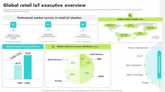 The following slide shows the executive summary of retail IoT industry which retail internet of things forecast market size for professional market services along with CAGR, top companies, global retail IoT market size, and revenue distribution. Do you have to make sure that everyone on your team knows about any specific topic I yes, then you should give IoT Application In Global Global Retail IoT Executive Overview Diagrams Pdf a try. Our experts have put a lot of knowledge and effort into creating this impeccable IoT Application In Global Global Retail IoT Executive Overview Diagrams Pdf You can use this template for your upcoming presentations, as the slides are perfect to represent even the tiniest detail. You can download these templates from the Slidegeeks website and these are easy to edit. So grab these today The following slide shows the executive summary of retail IoT industry which retail internet of things forecast market size for professional market services along with CAGR, top companies, global retail IoT market size, and revenue distribution.