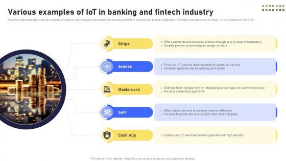 Following slide represents real life examples of using IoT technologies and solutions for banking and fintech services that provides digitization. It includes elements such as Stripe, Armis, Mastercard, SoFi, etc. Boost your pitch with our creative Various Examples Of IoT In Banking And Fintech Industry IoT In Banking For Digital Future IoT SS V. Deliver an awe-inspiring pitch that will mesmerize everyone. Using these presentation templates you will surely catch everyones attention. You can browse the ppts collection on our website. We have researchers who are experts at creating the right content for the templates. So you do not have to invest time in any additional work. Just grab the template now and use them. Following slide represents real life examples of using IoT technologies and solutions for banking and fintech services that provides digitization. It includes elements such as Stripe, Armis, Mastercard, SoFi, etc.
