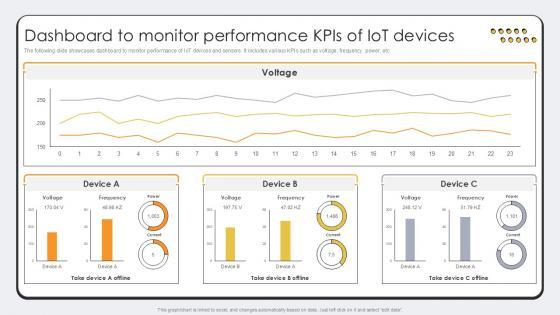 The following slide showcases dashboard to monitor performance of IoT devices and sensors. It includes various KPIs such as voltage, frequency, power, etc. Formulating a presentation can take up a lot of effort and time, so the content and message should always be the primary focus. The visuals of the PowerPoint can enhance the presenters message, so our Dashboard To Monitor Performance KPIS Of IOT Devices Streamlining Production Ppt Powerpoint was created to help save time. Instead of worrying about the design, the presenter can concentrate on the message while our designers work on creating the ideal templates for whatever situation is needed. Slidegeeks has experts for everything from amazing designs to valuable content, we have put everything into Dashboard To Monitor Performance KPIS Of IOT Devices Streamlining Production Ppt Powerpoint The following slide showcases dashboard to monitor performance of IoT devices and sensors. It includes various KPIs such as voltage, frequency, power, etc.