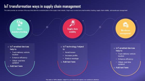 This slide provides an overview of the ways that allow the revolutionization of the supply chain industry. Major ways covered are smart inventory tracking, supply chain visibility, and warehouse management. There are so many reasons you need a IoT Transformation Ways In IoT Fleet Monitoring Ppt Sample IoT SS V. The first reason is you can not spend time making everything from scratch, Thus, Slidegeeks has made presentation templates for you too. You can easily download these templates from our website easily. This slide provides an overview of the ways that allow the revolutionization of the supply chain industry. Major ways covered are smart inventory tracking, supply chain visibility, and warehouse management.