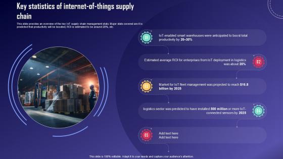This slide provides an overview of the key IoT supply chain management stats. Major stats covered are it is predicted that productivity will be boosted, ROI is estimated to be around 20 percent, etc. Do you have to make sure that everyone on your team knows about any specific topic I yes, then you should give Key Statistics Of Internet Of IoT Fleet Monitoring Ppt PowerPoint IoT SS V a try. Our experts have put a lot of knowledge and effort into creating this impeccable Key Statistics Of Internet Of IoT Fleet Monitoring Ppt PowerPoint IoT SS V. You can use this template for your upcoming presentations, as the slides are perfect to represent even the tiniest detail. You can download these templates from the Slidegeeks website and these are easy to edit. So grab these today This slide provides an overview of the key IoT supply chain management stats. Major stats covered are it is predicted that productivity will be boosted, ROI is estimated to be around 20 percent, etc.