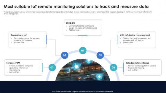 This slide provides an overview of the remote monitoring solutions that manage and controls multiple devices. Major solutions covered are senseye PDM, skyspark, Datadog IoT monitoring TeamViewer IoT and AWS device management. If your project calls for a presentation, then Slidegeeks is your go-to partner because we have professionally designed, easy-to-edit templates that are perfect for any presentation. After downloading, you can easily edit Optimization Of IoT Remote Monitoring Most Suitable IoT Remote Monitoring Solutions To Track IoT SS V and make the changes accordingly. You can rearrange slides or fill them with different images. Check out all the handy templates This slide provides an overview of the remote monitoring solutions that manage and controls multiple devices. Major solutions covered are senseye PDM, skyspark, Datadog IoT monitoring TeamViewer IoT and AWS device management.