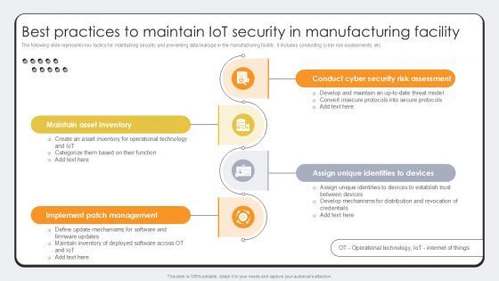The following slide represents key tactics for maintaining security and preventing data leakage in the manufacturing facility. It includes conducting cyber risk assessments, etc. Do you have an important presentation coming up Are you looking for something that will make your presentation stand out from the rest Look no further than Best Practices To Maintain IOT Security In Manufacturing Facility Streamlining Production Ppt Template With our professional designs, you can trust that your presentation will pop and make delivering it a smooth process. And with Slidegeeks, you can trust that your presentation will be unique and memorable. So why wait Grab Best Practices To Maintain IOT Security In Manufacturing Facility Streamlining Production Ppt Template today and make your presentation stand out from the rest The following slide represents key tactics for maintaining security and preventing data leakage in the manufacturing facility. It includes conducting cyber risk assessments, etc.