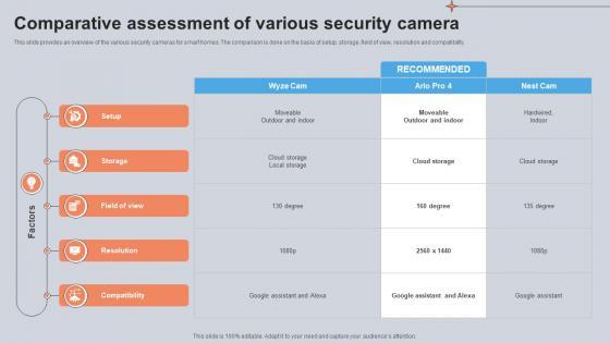 This slide provides an overview of the various security cameras for smart homes. The comparison is done on the basis of setup, storage, field of view, resolution and compatibility. Present like a pro with Comparative Assessment Of Various Security Camera Utilizing Smart Appliances IoT SS V. Create beautiful presentations together with your team, using our easy-to-use presentation slides. Share your ideas in real-time and make changes on the fly by downloading our templates. So whether you are in the office, on the go, or in a remote location, you can stay in sync with your team and present your ideas with confidence. With Slidegeeks presentation got a whole lot easier. Grab these presentations today. This slide provides an overview of the various security cameras for smart homes. The comparison is done on the basis of setup, storage, field of view, resolution and compatibility.