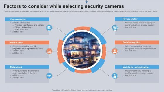 This slide provides an overview of the consideration factors for purchasing security cameras. Major factors covered are video resolution, field of view, night vision, multi-factor authentication, facial recognition and privacy shutter. Coming up with a presentation necessitates that the majority of the effort goes into the content and the message you intend to convey. The visuals of a PowerPoint presentation can only be effective if it supplements and supports the story that is being told. Keeping this in mind our experts created Factors To Consider While Selecting Security Cameras Utilizing Smart Appliances IoT SS V to reduce the time that goes into designing the presentation. This way, you can concentrate on the message while our designers take care of providing you with the right template for the situation. This slide provides an overview of the consideration factors for purchasing security cameras. Major factors covered are video resolution, field of view, night vision, multi-factor authentication, facial recognition and privacy shutter.
