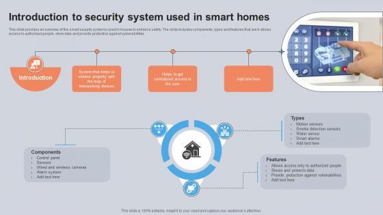 This slide provides an overview of the smart security systems used in houses to enhance safety. The slide includes components, types and features that are it allows access to authorized people, store data and provide protection against vulnerabilities. Create an editable Introduction To Security System Used In Smart Homes Utilizing Smart Appliances IoT SS V that communicates your idea and engages your audience. Whether you are presenting a business or an educational presentation, pre-designed presentation templates help save time. Introduction To Security System Used In Smart Homes Utilizing Smart Appliances IoT SS V is highly customizable and very easy to edit, covering many different styles from creative to business presentations. Slidegeeks has creative team members who have crafted amazing templates. So, go and get them without any delay. This slide provides an overview of the smart security systems used in houses to enhance safety. The slide includes components, types and features that are it allows access to authorized people, store data and provide protection against vulnerabilities.