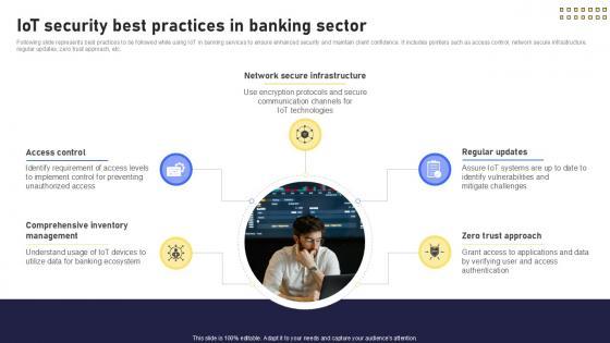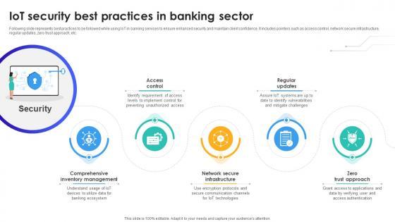Following slide represents best practices to be followed while using IoT in banking services to ensure enhanced security and maintain client confidence. It includes pointers such as access control, network secure infrastructure, regular updates, zero trust approach, etc. Make sure to capture your audiences attention in your business displays with our gratis customizable IoT Security Best Practices In Banking Sector IoT In Banking For Digital Future IoT SS V. These are great for business strategies, office conferences, capital raising or task suggestions. If you desire to acquire more customers for your tech business and ensure they stay satisfied, create your own sales presentation with these plain slides. Following slide represents best practices to be followed while using IoT in banking services to ensure enhanced security and maintain client confidence. It includes pointers such as access control, network secure infrastructure, regular updates, zero trust approach, etc.