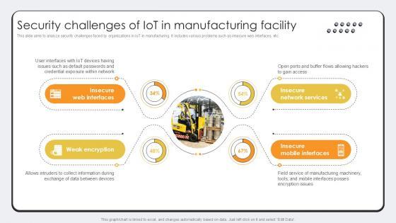 This slide aims to analyze security challenges faced by organizations in IoT in manufacturing. It includes various problems such as insecure web interfaces, etc. Here you can discover an assortment of the finest PowerPoint and Google Slides templates. With these templates, you can create presentations for a variety of purposes while simultaneously providing your audience with an eye-catching visual experience. Download Security Challenges Of IoT In Revolutionizing Production IoT Ppt Example to deliver an impeccable presentation. These templates will make your job of preparing presentations much quicker, yet still, maintain a high level of quality. Slidegeeks has experienced researchers who prepare these templates and write high-quality content for you. Later on, you can personalize the content by editing the Security Challenges Of IoT In Revolutionizing Production IoT Ppt Example. This slide aims to analyze security challenges faced by organizations in IoT in manufacturing. It includes various problems such as insecure web interfaces, etc.