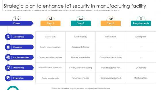 The following slide represents key tactics for maintaining security and preventing data leakage in the manufacturing facility. It includes conducting cyber risk assessments, etc. Slidegeeks is one of the best resources for PowerPoint templates. You can download easily and regulate Strategic Plan To Enhance IOT Security In Manufacturing Facility Streamlining Production Ppt Sample for your personal presentations from our wonderful collection. A few clicks is all it takes to discover and get the most relevant and appropriate templates. Use our Templates to add a unique zing and appeal to your presentation and meetings. All the slides are easy to edit and you can use them even for advertisement purposes. The following slide represents key tactics for maintaining security and preventing data leakage in the manufacturing facility. It includes conducting cyber risk assessments, etc.