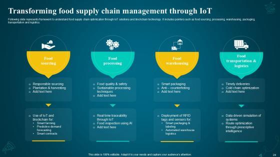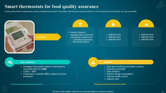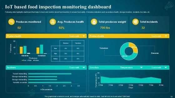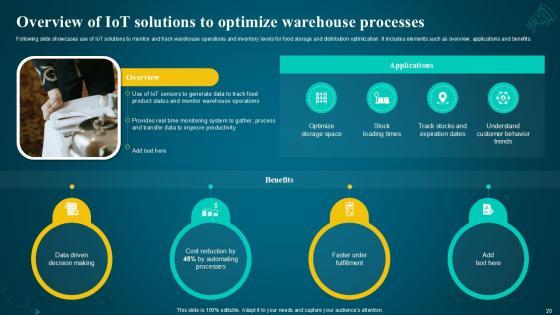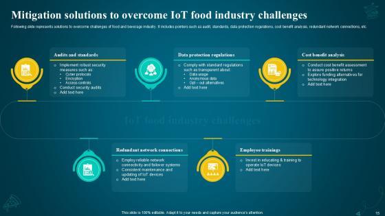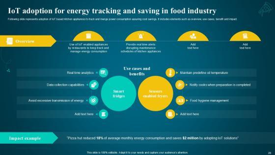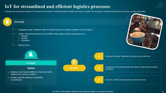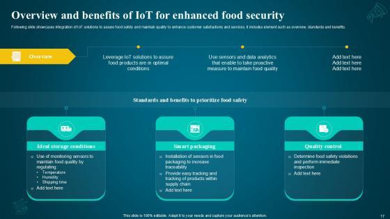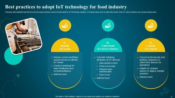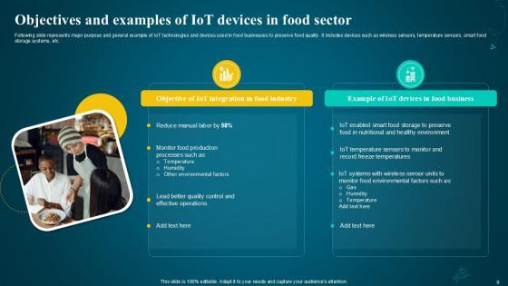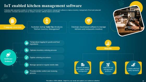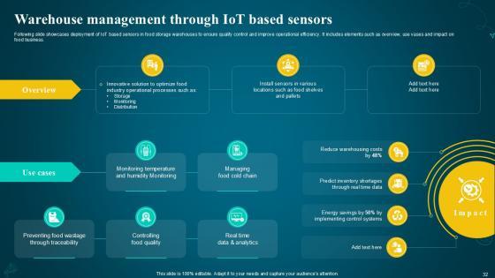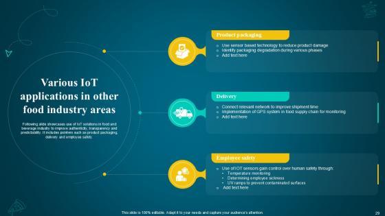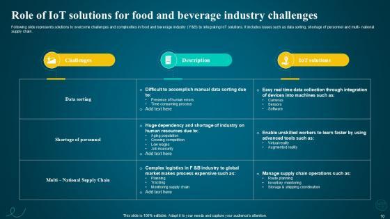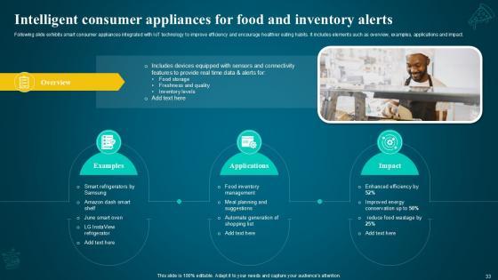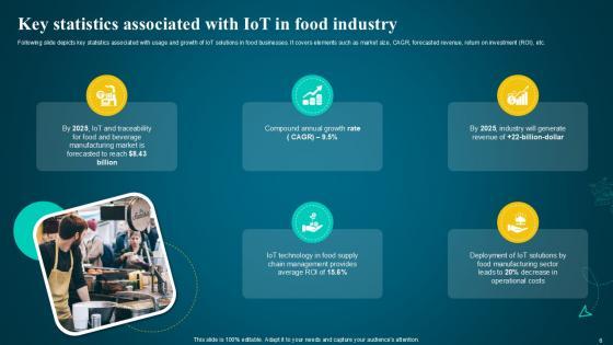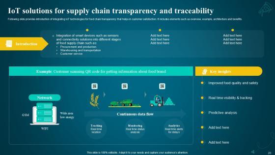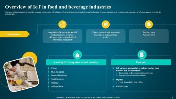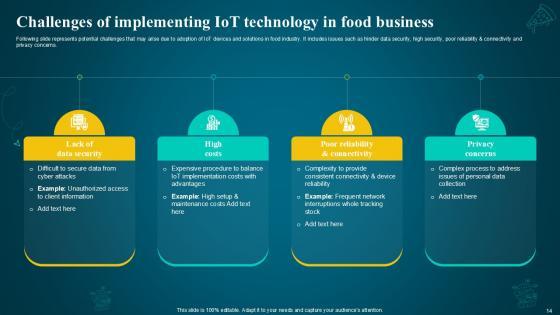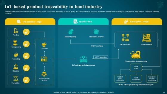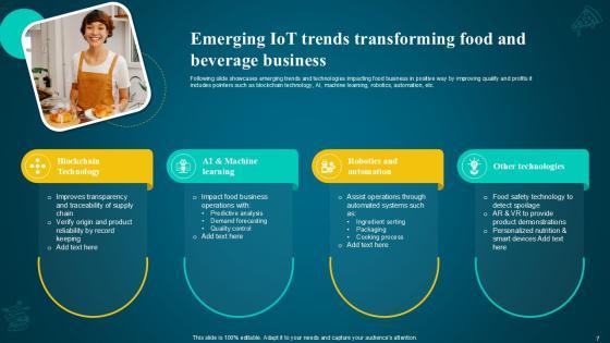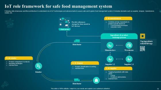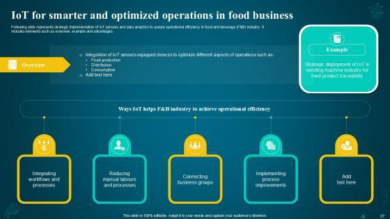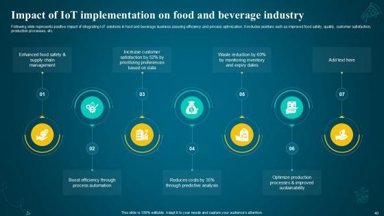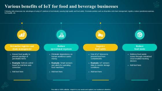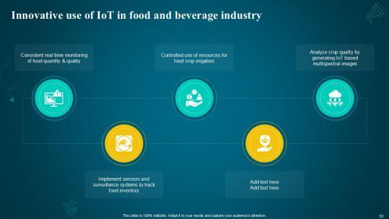 This fifty eight-slide IoT Use Cases For Food And Beverage Industries Ppt Example IoT CD V is your content ready tool to impress the stakeholders with your business planning and its manner of execution. Showcase your ideas and how you plan to make them real in detail with this PPT Template Bundle. The slides have the conceptual bandwidth to present the crucial aspects of your plan, such as funding, marketing, resource allocation, timeline, roadmap, and more. When you present your plans with this PPT Layout, the stakeholders are sure to come on board because you will be able to present a succinct, thought-out, winning project. Download this Complete Deck now to take control into your hands. The 100 percent customizable offer is just too good to be resisted. Our IoT Use Cases For Food And Beverage Industries Ppt Example IoT CD V are topically designed to provide an attractive backdrop to any subject. Use them to look like a presentation pro.