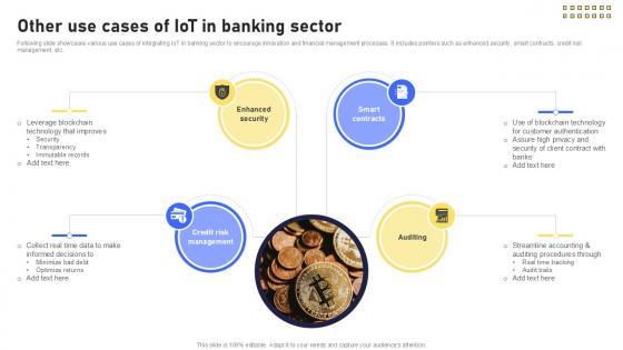 Following slide showcases various use cases of integrating IoT in banking sector to encourage innovation and financial management processes. It includes pointers such as enhanced security, smart contracts, credit risk management, etc. The best PPT templates are a great way to save time, energy, and resources. Slidegeeks have 100 percent editable powerpoint slides making them incredibly versatile. With these quality presentation templates, you can create a captivating and memorable presentation by combining visually appealing slides and effectively communicating your message. Download Other Use Cases Of IoT In Banking Future With IoT Ppt Example IoT SS V from Slidegeeks and deliver a wonderful presentation. Following slide showcases various use cases of integrating IoT in banking sector to encourage innovation and financial management processes. It includes pointers such as enhanced security, smart contracts, credit risk management, etc.