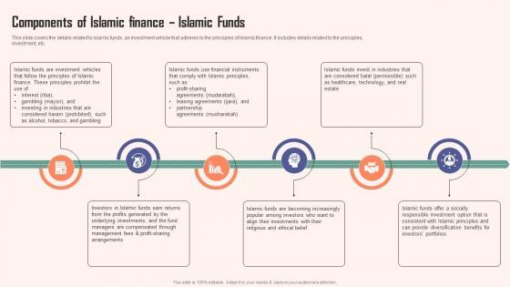 This slide covers the details related to Islamic funds, an investment vehicle that adheres to the principles of Islamic finance. It includes details related to the principles, nvestment, etc. Do you have to make sure that everyone on your team knows about any specific topic I yes, then you should give Components Of Islamic Finance Islamic Funds Comprehensive Guide Islamic Inspiration PDF a try. Our experts have put a lot of knowledge and effort into creating this impeccable Components Of Islamic Finance Islamic Funds Comprehensive Guide Islamic Inspiration PDF. You can use this template for your upcoming presentations, as the slides are perfect to represent even the tiniest detail. You can download these templates from the Slidegeeks website and these are easy to edit. So grab these today This slide covers the details related to Islamic funds, an investment vehicle that adheres to the principles of Islamic finance. It includes details related to the principles, nvestment, etc.