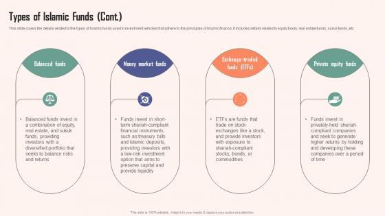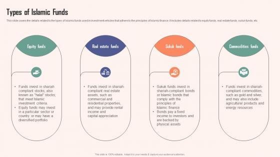 This slide covers the details related to the types of Islamic funds used in investment vehicles that adhere to the principles of Islamic finance. It includes details related to equity funds, real estate funds, sukuk funds, etc. Explore a selection of the finest Types Of Islamic Funds A Detailed Knowledge Of Islamic Finance Formats Pdf here. With a plethora of professionally designed and pre made slide templates, you can quickly and easily find the right one for your upcoming presentation. You can use our Types Of Islamic Funds A Detailed Knowledge Of Islamic Finance Formats Pdf to effectively convey your message to a wider audience. Slidegeeks has done a lot of research before preparing these presentation templates. The content can be personalized and the slides are highly editable. Grab templates today from Slidegeeks. This slide covers the details related to the types of Islamic funds used in investment vehicles that adhere to the principles of Islamic finance. It includes details related to equity funds, real estate funds, sukuk funds, etc.