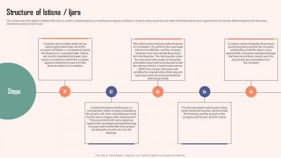 This slide covers the details related to the istisna a sales contract whereby a manufacturer agrees to deliver a made-to-order asset at a pre-determined future time at an agreed price. It includes details related to the financing structure based on Islamic law. Present like a pro with Structure Of Istisna Ijara Comprehensive Guide Islamic Rules PDF Create beautiful presentations together with your team, using our easy-to-use presentation slides. Share your ideas in real-time and make changes on the fly by downloading our templates. So whether you are in the office, on the go, or in a remote location, you can stay in sync with your team and present your ideas with confidence. With Slidegeeks presentation got a whole lot easier. Grab these presentations today. This slide covers the details related to the istisna a sales contract whereby a manufacturer agrees to deliver a made-to-order asset at a pre-determined future time at an agreed price. It includes details related to the financing structure based on Islamic law.