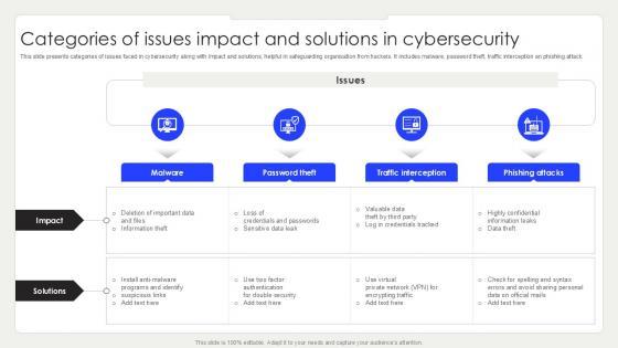 This slide presents categories of issues faced in cybersecurity along with impact and solutions, helpful in safeguarding organisation from hackers. It includes malware, password theft, traffic interception an phishing attack. Explore a selection of the finest Categories Of Issues Impact And Solutions In Cybersecurity PPT Template SS here. With a plethora of professionally designed and pre-made slide templates, you can quickly and easily find the right one for your upcoming presentation. You can use our Categories Of Issues Impact And Solutions In Cybersecurity PPT Template SS to effectively convey your message to a wider audience. Slidegeeks has done a lot of research before preparing these presentation templates. The content can be personalized and the slides are highly editable. Grab templates today from Slidegeeks. This slide presents categories of issues faced in cybersecurity along with impact and solutions, helpful in safeguarding organisation from hackers. It includes malware, password theft, traffic interception an phishing attack.