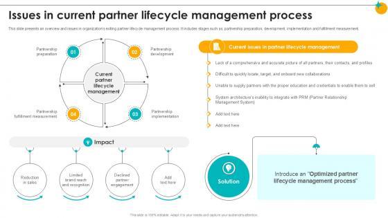 This slide presents an overview and issues in organizations exiting partner lifecycle management process. It includes stages such as, partnership preparation, development, implementation and fulfillment measurement. Slidegeeks is one of the best resources for PowerPoint templates. You can download easily and regulate Issues In Current Partner Lifecycle Management Process Partner Relationship Ppt Template for your personal presentations from our wonderful collection. A few clicks is all it takes to discover and get the most relevant and appropriate templates. Use our Templates to add a unique zing and appeal to your presentation and meetings. All the slides are easy to edit and you can use them even for advertisement purposes. This slide presents an overview and issues in organizations exiting partner lifecycle management process. It includes stages such as, partnership preparation, development, implementation and fulfillment measurement.
